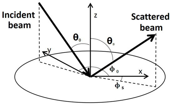 where θ0 and ϕ0 are the elevation and azimuth angles of the incident ray, respectively; θs and ϕs are the elevation and azimuth angles of the scattered ray, respectively; L is the differential radiance of the scattering surface; and E is the differential incident irradiance [15]. When the BSDF of the mirror of an optical system is expressed as a directional cosine function, its magnitude is only related to the direction of reflection and the direction of scattering [16].