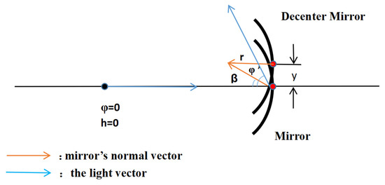 where α is the value of the tilt. Combined with the linear variation relationship of the light vector, the change in the light vector after passing through the ith mirror with decenter and tilt can be expressed as