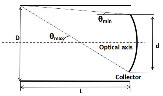 When the source plane is used as the emitting plane and the primary mirror is used as the radiation-receiving plane, it does not correspond to stray light radiative transfer. Therefore, this process is described by the radiation-receiving coefficient (S) of its energy transfer. The light of the source surface is incident on the primary mirror at different angles, and the effective receiving area of the primary mirror receives a different energy, resulting in a different stray light energy. Similarly, the longer the length of the baffle, the stronger the limiting effect on the incident stray light at angles outside of the field of view. Therefore, the received energy can be expressed as a function of the angle of incident light. As illustrated in Figure 5 below. It can be simplified as shown in the following model, where D is the size of the light source surface/the size of the baffles’ aperture, L is the distance from the light source surface to the primary mirror/the length of baffles, and the axis is the primary mirror’s optical axis. When D = d, the maximum specular radiation reception angle θmax can be expressed as