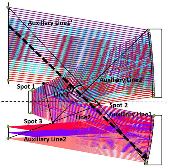 As it can be seen in Figure 6, the area enclosed by the triangle is the path of the normal imaging light and cannot be obscured. The triangle is enclosed by the intersection (point j) of the lower ray emanating from the jth surface with the upper ray emanating from the j + 1th surface. This triangular range can also be extended according to the structure of the optical machine. All points can be calculated according to the optical system design parameters or derived directly from the optical system model. Line j is the line connecting point j to point j + 1, the auxiliary line j is the line connecting the upper point of surface j to the lower point of line j, and the auxiliary line j’ is the line connecting the lower point of line j to the lower point of the surface where the light reaches. As shown above, when the slope of the angle of incidence is greater than the slope of line1, lower than the slope of the auxiliary line1, and lower than the slope of auxiliary line1′, i.e., within the angle θ, it represents the range in which the stray light generated by light from outside of the field of view arriving at the tertiary mirror causes the detector to respond. Also, the angle θ limits the through energy, using θ/90 to approximate the ratio of the through energy. The dashed black line represents the light that reaches the tertiary mirror directly, which produces a once-scattered attenuation stray light that causes the detector to respond, and this angle produces a PST peak.