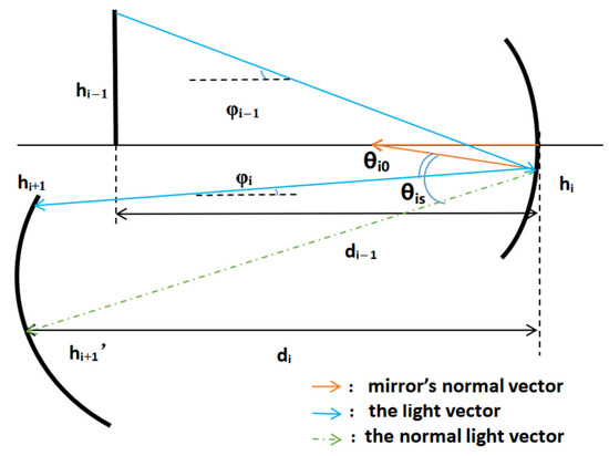 Since φi is the angle of the light after specular reflection, it is inconvenient to calculate it in a sequential iteration. According to the geometric relationship, it can also be expressed as