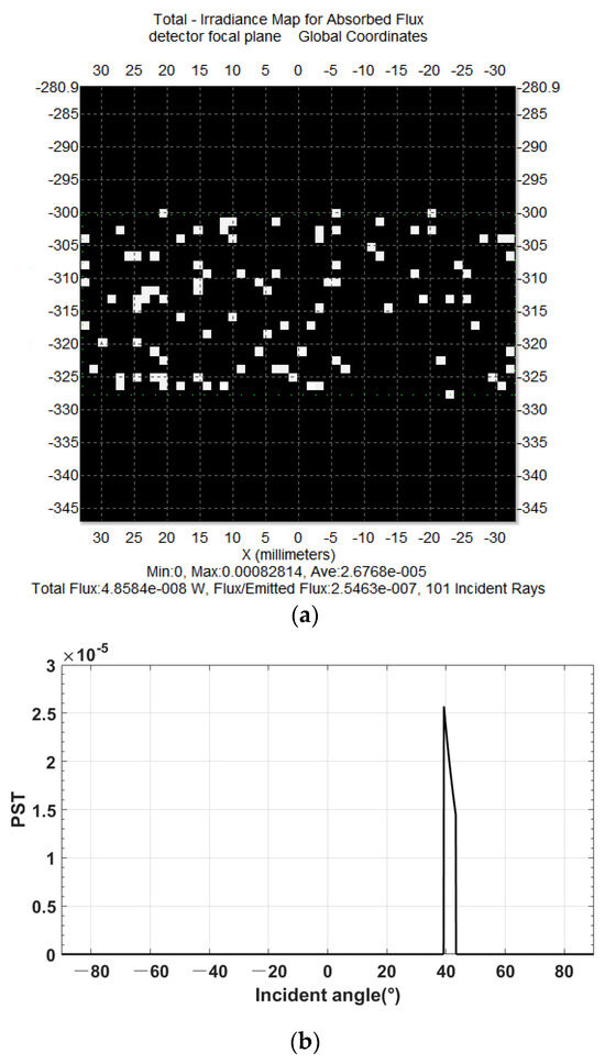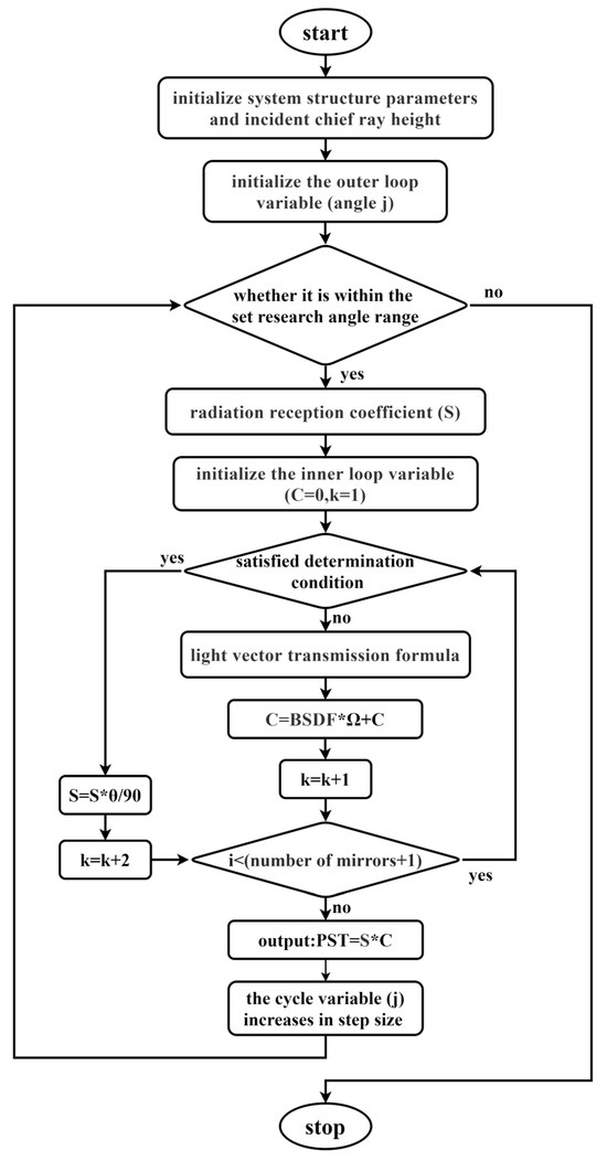 Based on the above model, the PST can be expressed as a function of the incident angle as a variable based on the structural parameters of the optical system (radius, mirror distance, and mirror scattering properties). The total stray radiation is derived by summing the radiation from each mirror, and it can be expressed as
