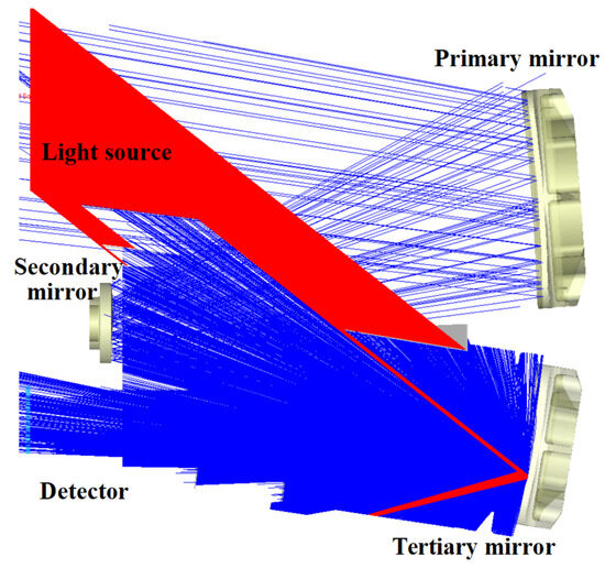 The surface-scattering property settings for the optical payload were derived from the measured BSDF data, which were fitted using the ABg model. The light source plane was set directly above the detector, tracing 1.2 million rays, and a light barrier was set outside the normal imaging path with perfect absorption properties, as shown in Figure 10 below. The red light is normal light and the blue light is the scatter light. At an off-axis angle of 39°, the rays outside the field of view reached the tertiary mirror and produced a once-scattered attenuation stray light that affected the detector.