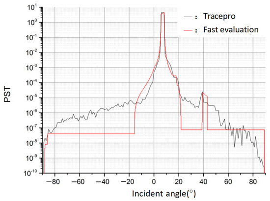 Based on the parameter settings in the previous section, we continued to use TracePro to plot the PST curve at a full angle, and the results are shown in the black curve in the figure below. According to the fast stray light performance evaluation prediction model, the results of the PST curve are as Figure 12.