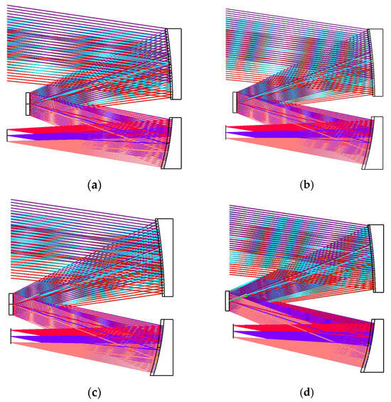 The design of internal and external stray light suppression structures, such as baffles, is based on the structural characteristics of the optical system, and the placement of the structure increases the volume and mass of the space optical payload [11]. Therefore, an optical system with a good stray light elimination capability is the focus of achieving lightweight miniaturization and improving imaging quality. It is important to study systems with a high stray light elimination capability in their optical system characteristics to find an optical system structure with a relatively superior stray light elimination performance in the same optical system imaging metrics [12,13]. Also, an optical system structure with superior stray light elimination performance can reduce the requirement for a quality mirror surface, reducing the expenditure. Furthermore, the rapid quantitative evaluation of the optical system’s stray light elimination performance is an important step and also has important scientific and engineering significance.