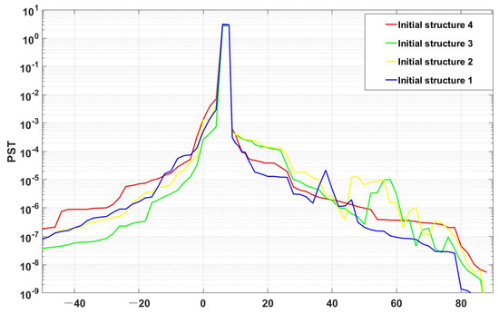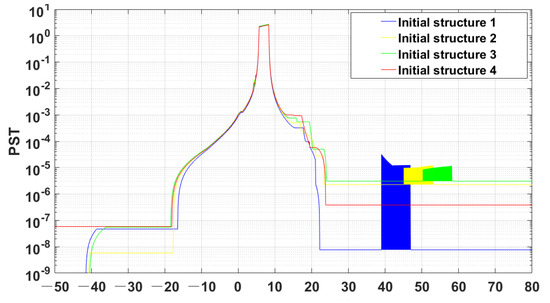 As it can be observed in the figure, the initial structure 4 has no peaks of out-of-field stray light protrusions, which indicates that this system structure has the effect of suppressing the once-scattered attenuation stray light caused by the out-of-field stray light. Moreover, the volume of the initial structure 4 is smaller than that of the others, and this method has the potential to find the optical structure with the optimal stray light suppression ability.