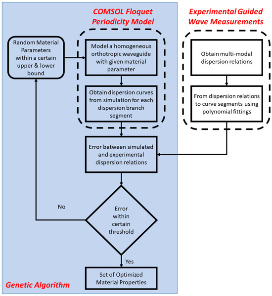Integrating experimental guided wave measurements with numerical models and optimization techniques is crucial for solving inverse problems and determining the mechanical properties of complex waveguides [23]. Both 2D and 3D finite element methods offer solutions for guided wave propagation [24,25,26]. Galerkin’s principle and energy velocities have been employed, revealing forward and backward waves in composite materials [27]. Fully discretized 3D finite element models were developed to understand dispersive guided wave propagation through commercial FEM software, such as Ansys 5.3 [28]. Furthermore, by assuming an analytical formulation along the wave propagation direction and only fully discretizing the 2D cross-section of a waveguide, the Semi-Analytical Finite Element (SAFE) method lends itself to compute wave dispersions with greatly reduced computational expenses [29,30,31]. More recently, researchers developed an extremely powerful tool that can be easily implemented in commercial FEM software for wave dispersion calculation leveraging Floquet periodicity [32]. Moreover, optimization algorithms have been developed for material characterization based on guided wave models and measurements. Zhu et al. [23] utilized an improved genetic algorithm (GA) to predict material properties, emphasizing the importance of proper wave mode selection for optimization. Their study achieved material property estimation accuracy of under 1%. Similar experiments involved composite plates, employing non-linear optimization to estimate material properties, achieving accuracy within a 10% range [27]. Cui et al. [29] used simulated annealing for anisotropic and quasi-isotropic laminates and analyzed wave modal sensitivities. Rautela et al. [33] developed a 1D Convolutional Neural Network for composite material properties, maintaining accuracy at around 1% with rapid training. Vishnuvardhan et al. [34] optimized all nine elastic constants of graphite–epoxy composite plates via GA, highlighting sensitivity analysis and achieving promising errors of approximately 1%. Genetic algorithms can generally support a performance similar to particle swarm optimization and outperform simulated annealing [35], and they are capable of handling complex multi-dimensional and multi-modal inverse problems [36]. Guided wave measurements incorporating computational optimization through GA offer precise material parameter estimation with enhanced accuracy and consistency compared to destructive testing, which enables material characterization and structural condition assessment.