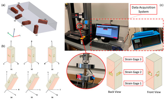 Static compression tests. (a) Sample configurations S1–S6 according to the grain direction. (b) Test samples and instrumentation. The axis shows the sample orientation, with each sample having an extra horizontally aligned strain gauge on the other side. (c) Data acquisition system setup for compression tests.