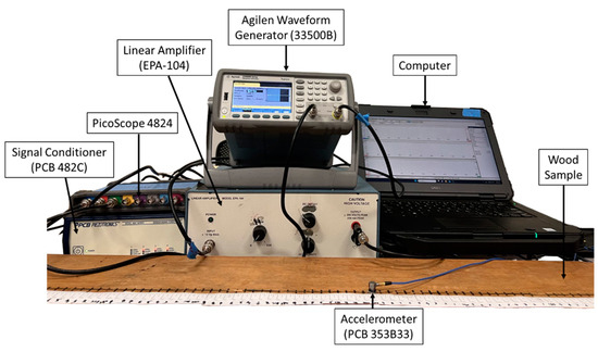An LVL bar from the same manufacturer and the same model number with a length of 2500 mm and a cross-section of 241.3 mm by 44.45 mm was used for the guided wave measurements. Both ends of the LVL bar were wrapped with clays to minimize wave reflections. A Lead Zirconate Titanate (PZT) disc (Navy type II, APC International, Ltd., Mackeyville, PA, USA) with a diameter of 14 mm and thickness of 12 mm was attached to the top surface of the LVL bar close to one end. A chirp voltage excitation swept from 1 to 12 kHz with an amplitude of 10 Volts Peak to Peak (Vpp) was configured via an Agilent 33500B series waveform generator (Agilent Technologies, Santa Clara, CA, USA). The chirp signal was set as 0.3 s long, amplified 20 times using an EPA-104 Linear Amplifier (Piezo Systems, Inc., Woburn, MA, USA), and applied on the PZT disc. Data collection was performed every 10 mm with a total of 200 measurement points. The out-of-plane wave motions were recorded at each data collection point using a uniaxial accelerometer (PCB model 353B33, PCB Piezotronics, Depew, NY, USA), which were first passed through a signal conditioner (PCB 482C, PCB Piezotronics, Depew, NY, USA) and then digitized by the Pico Scope 4824 (pico Tchnology, St. Neots, Cambridgeshire, UK) with a 1 MHz sampling frequency, as shown in Figure 3. Ten repetitive data collections were conducted and averaged for each point to improve the signal-to-noise ratio (SNR). The obtained temporal–spatial sampling of dynamic responses was then converted to dispersion relations in the frequency–wavenumber domain via 2D-FFT using the MATLAB signal processing toolbox.