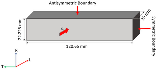 Two Floquet periodicity models were established: a full model and a quarter model. The full model incorporates the full cross-section of 241.3 mm by 44.45 mm, whereas the latter one only needs to model a quarter of the cross-section using symmetric settings. As vertical flexural (VF) modes generally feature large out-of-plane motions, a symmetric boundary in the LR plane and an antisymmetric boundary in the LT plane were implemented in the quarter model, as shown in Figure 4. One of the cross-section faces is treated as the source and the other as the destination for sweeping the wavenumber (k) using the Floquet theorem. The unit cell thickness is set to 20 mm to ensure it can cover a reasonable range of wavenumbers for modes of interest. The mesh size is adjusted to 20 times smaller than the wavelength for model convergence.