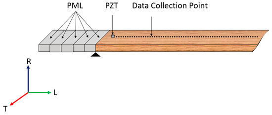 On the other hand, a frequency-domain numerical model was built to analyze wave modes promoted in the LVL bar by a PZT disc, which would be beneficial for optimization. The frequency-domain simulation was based on material properties from the 1st compression test and the exact dimensions as used in the experiment, along with the nominal piezoelectric material (PZT 5A equivalent to APC 850 Navy II material, APC International, Ltd., Mackeyville, PA, USA). The PZT disc was modeled using the Electrostatics module in COMSOL combined with the Solid Mechanics module. These two components were then coupled using the piezoelectric effect Multiphysics module. A 20 Volt excitation was applied to the terminal of the PZT disc where the other end was grounded. As shown in Figure 5, five layers of Perfectly Matched Layer (PML) domains were added to both ends of the model to suppress the reflection of the waves [41], which simulates the suppression of wave reflection in the experimental setup using clays. The mesh size was set up to be 7.5 mm, which is approximately 1/20 of the wavelength for the given input excitation. The frequency was then swept from 2 to 7.5 kHz, which is the targeted frequency range. Steady-state solutions at 200 points with a 10 mm interval on the top surface were obtained for harmonic excitation at each frequency. Complex displacements sampled through the data collection points were converted to dispersion relations in the frequency–wavenumber (f–k) domain using FFT.