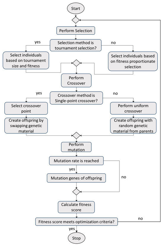 An effective method for material parameter identification is utilizing guided waves and corresponding dispersion curves. Dispersion curves represent the relationships between the frequency and wavenumber of guided modes and are sensitive to variations in material parameters and geometry. Thus, a genetic algorithm (GA) was proposed for identifying mechanical properties by updating the Floquet periodicity model until it yields dispersion curves closely resembling experimental dispersion relations. The general workflow for the genetic algorithm is shown in Figure 6. In general, mechanical properties are first fed into the GA to be optimized and randomized, resulting in a set of N populations. It is notable that population is defined as a set of individuals at a particular iteration of the genetic algorithm, and an individual is the group of parameters to be optimized, namely, the elastic constants from C11 to C66. The fitness function is then calculated for each set of parameters and returns a fitness value that signifies if it is the best result (lower value being better). Based on the fitness value, the population is selected for the next generation, similar to biological evolution. The rank selection process selects random individuals based on their rank, which was used in conjunction with tournament selection. The selected population then undergoes crossover, where specific population parameters become exchanged. Similarly, there is a chance of mutation, where some of the populations are again randomized. Mutation was conducted to introduce randomness during the selection process, and adjusting the mutation rate could allow for the algorithm to not become stuck in local minima and achieve the global optimization. Thus, after these steps, a new set of offspring populations is formed, and the process continues for several generations, which controls the maximum number of iterations as well as the model convergence. The genetic algorithm is a multi-variable global optimization technique, which is ideal for the problem at hand.