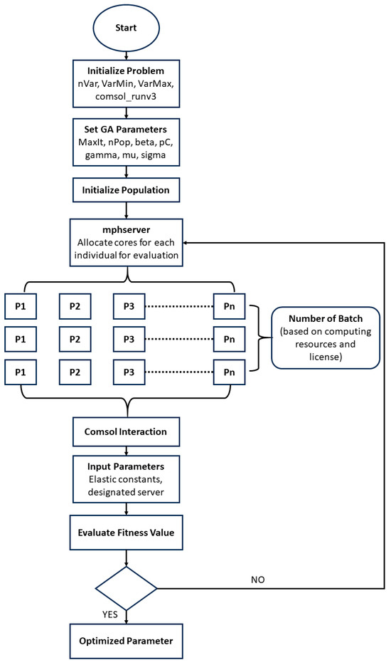 To handle the computation complexity, the numerical model and GA were implemented on designated cores in the Center for High-Performance Computing (CHPC) at the University of Utah through a workflow shown in Figure 7. With the COMSOL MATLAB LiveLink protocol, for each batch of population from P1 to Pn, multiple COMSOL servers were assigned based on the available cores at the CHPC. Hyperparameters, including MaxIt, nPop, beta, pC, and mu, control the maximum number of iterations, the number of populations, probability distribution function during selection, probability of crossover, mutation rate, and standard deviation that determines the extent of mutation. Servers performed parallel COMSOL simulations for each individual model (which comprises a set of optimizable parameters). The limit to the number of iterations would be set based on the change in the fitness value over the iterations or the maximum of 100. Inputs (elastic constants) for all COMSOL models were configured via MATLAB R2023b, and the estimated dispersion curves were extracted and compared with the ground truth to compute the fitness value. The optimization was conducted in two rounds due to the time allocation limitations on the CHPC servers. This process helped to limit the search area for the simulation as well as lead to more accurate parameter identification. As the optimization techniques were finalized, a sensitivity analysis was carried out to assess how the fitness value changes with varying mechanical properties.