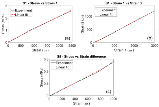 The stress–strain curves from the compression tests were obtained for each sample to calculate elastic constants and Poisson’s ratios. According to Table 1 and Equation (1), elastic moduli can be calculated by using the load cell for stress calculation and strain gauges for strain measurements. Ratios of stress and strain yield the moduli of elasticity, whereas the ratio of strains at various directions gives Poisson’s ratios. The linear fit of the stress–strain and strain–strain curves from S1 and S5 is showcased in Figure 8. The stress–strain curve fits linearly and yields Young’s modulus for samples S1, S2, and S3, which are the samples aligned with the T, R, and L directions, respectively. Poisson’s ratios were estimated based on strain–strain curves of these samples. Similarly, for the three angled samples (S4, S5, and S6), the ratio of the stress and the difference in strains gives three shear moduli of elasticity. This results in the evaluation of all the nine independent elastic constants for the LVL material. Results from three compression tests are shown in Table 2. The variations in material parameters through these compression tests are significant and can be attributed to internal defects and natural variability within the material, as the engineered wood is made from natural wood veneers where defects internal to and between veneers, as well as knots and disbonds, can affect the wood samples’ performance.