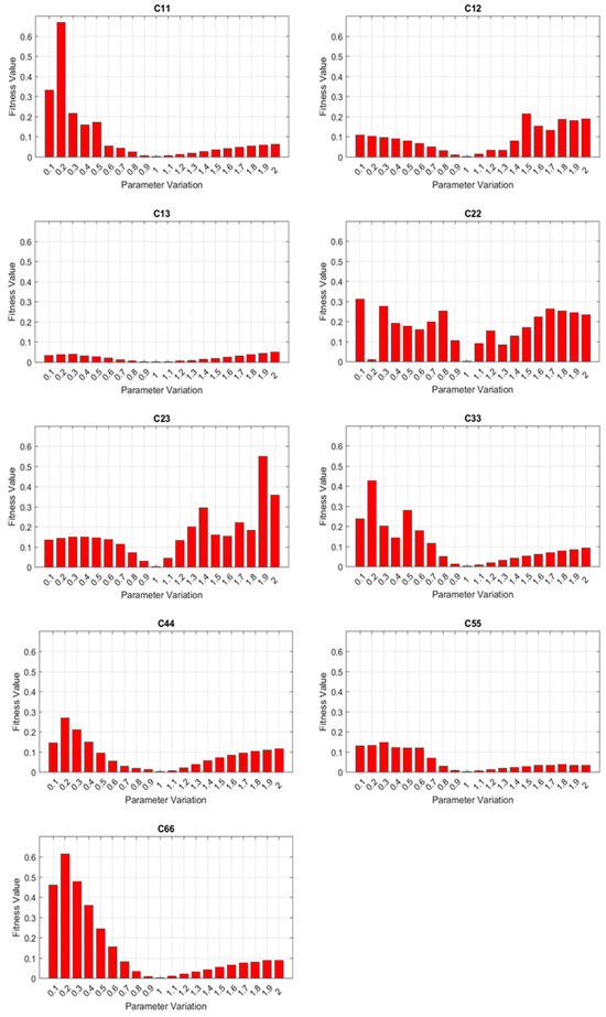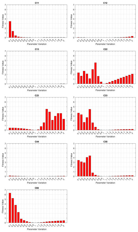 Prior to performing parameter identification, parametric sensitivities were analyzed to assess if changes in material parameters would induce sensible variations in dispersion curves. A parametric sweeping was performed on each of the nine elastic constants obtained from the first compression test. For each elastic constant, we swept its value from 0.1 to 2 times the corresponding nominal value, where other parameters were set as nominal values. The fitness values were computed based on Equation (4) for parametric sweeping. Because the fitness values were computed against the ground truth based on the set of nominal values, nominal elastic constants shall yield the minimum error or fitness value. The sensitivity analysis results based on the full Floquet periodicity model, where all the wave modes were considered, are shown in Figure 9. It is notable that a full set of wave modes from the full Floquet periodicity model can support reasonable sensitivity to the majority of material parameters, except C13 and C55. Variations in fitness values throughout the parametric sweeping indicate the sensitivity: the larger the change in amplitude, the more sensitive the dispersion curves are to the specific parameter. Moreover, the presence of local minimums in the sensitivity study could also affect the performance.