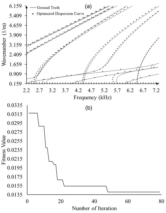 By extracting polynomial fitted curves from the simulated dispersion relations, optimization was performed using three vertical flexural modes only. A reasonable agreement was obtained between dispersion curves generated by the quarter Floquet periodicity model using nominal values (ground truth) and simulated dispersion relations from the frequency-domain analysis, as shown in Figure 13a. The parameters converged in 82 generations with a fitness score of 0.0105, as shown in Figure 13b. Due to the lack of sensitivities to a subset of elastic constants, estimated material parameters, as shown in Table 5, demonstrate significantly higher error ratios compared to the full model prediction (Table 4). The elastic constants of C13, C23, and C55 demonstrate errors over 15%. According to Figure 11, the vertical flexural modes show little sensitivity to C13 and low sensitivity in a wide range of C23 and C55.