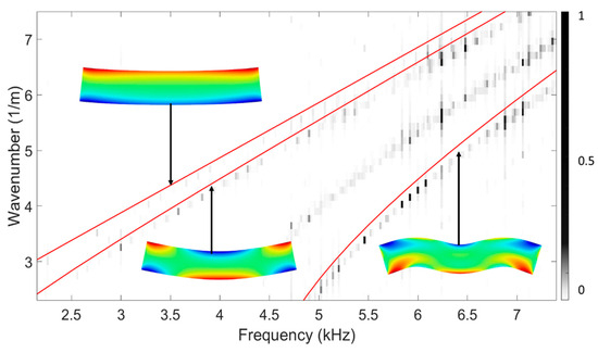 However, not all wave mode families can be easily excited in practice. The vertical flexural or VF mode family was used in our experiment due to its easier-to-measure out-of-plane components compared to other mode families. Thus, sensitivity analysis was performed on all the elastic constants only using dispersion curves of the VF mode family, in which C11, C12, C22, C23, C33, C55, and C66 demonstrate appreciable sensitivities measured by the fitness function, as shown in Figure 11. Moreover, frequency-domain finite element analysis was conducted to obtain dispersion relations when the LVL bar is subjected to PZT’s excitation. While it generates both VF and longitudinal modes, VF modes are generally dominant in experimental measurements due to the test setup. With nominal material properties and consistent waveguide geometry, the dispersion relations align well with the dispersion curves from the quarter Floquet periodicity model, as shown in Figure 12. It is notable that the frequency-domain analysis agrees with the result of the quarter Floquet periodicity model except for one mode, which was not captured by the quarter Floquet theorem-based model. The mode shapes based on the eigenanalysis demonstrate an antisymmetric displacement field in terms of displacement along the wave propagation direction, which verifies the excited vertical flexural modes.
