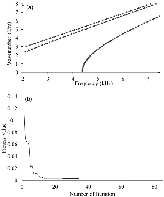 To validate the proposed framework, optimization was performed using dispersion curves predicted by the full Floquet periodicity model with the nominal material properties as the ground truth to estimate the mechanical properties. As shown in Figure 10a, the optimized elastic constants yield dispersion curves (dots) resembling the ground truth (solid lines)—dispersion curves based on nominal mechanical properties. Moreover, the fitness value converged to 0.0135 around 80 generations, as shown in Figure 10b. The estimated elastic constants and errors are shown in Table 4, yielding an excellent estimation accuracy except for C13 and C55, for which the full wave modes are less sensitive according to the sensitivity analysis.
