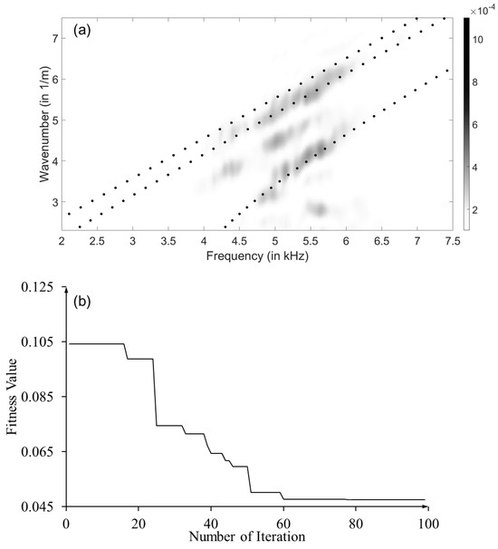 Optimization results based on the quarter Floquet periodicity model and experiments: (a) comparison of optimized dispersion curves overlaid with experimental dispersion relations (experimental dispersion relations: color map; optimized dispersion curves: dots); and (b) fitness values through generations in GA.