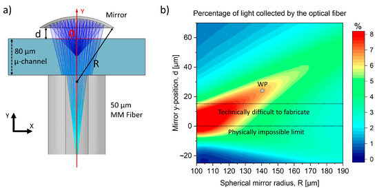 Optimization was performed using COMSOL Multiphysics (base and geometric optics module) in order to determine the radius (R) and position of the mirror relative to the microfluidic channel (d) that maximize the collection efficiency of the detection system (curved mirror + fiber optic) along the red line (see Figure 3a). A point source of spherical rays positioned at the center of the microchannel and on the axis of the fiber (−40 µm position in Figure 3a) was used to calculate the fraction of light collected by the fiber for each mirror position and radius. The resulting map reported in Figure 3b shows how reducing the curvature of the mirror (R < 170 µm) increases the light collected as the mirror approaches the microfluidic channel (d → 0 μm).