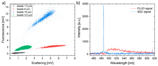 The proposed chip geometry enables the simultaneous (in time and space) enhancement and acquisition of both signals (fluorescence and scattering) on the same detection fiber. To characterize the detection capabilities of the chip as an optofluidic flow cytometer, the signals from a mixture of florescent beads of different sizes (with diameters of 10 µm, 6 µm, 3.5 µm and 1.5 µm) were compared. In particular, all the beads were functionalized with the same fluorophore, except the 6-micron family, which is loaded with a less efficient one. The combination of fluorescence and scattering information significantly contributes to the correct identification of the four beads populations. This is very clear from Figure 5a. For instance, by looking at the signals correspondent to the 3.5 and 6 µm beads populations, we observe that if only the fluorescence signal is considered (between 1 and 2 mV for both populations), they could not be distinguished, while they correspond to very different scattering signals (0.5–2.5 for 3.5 µm beads and 3.5–7.0 for 6 µm beads), thus allowing the different populations to be clearly identified. Similarly, the difference between the 1.5 and 3 µm beads is mainly in their fluorescence emission, while the two populations produce a very similar scattering signal.