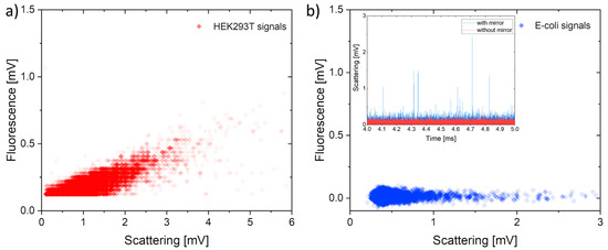 (a) Correlation between scattering and fluorescence signals obtained by analyzing HEK293T cells made fluorescent by CellMaskTM molecules. (b) Signals obtained by analyzing a water sample contaminated by Escherichia coli bacteria using the chip with a spherical mirror. In this case, the fluorescence signal was below the detection limit. Incept—time behavior of the E. coli scattering signal obtained with (blue) and without (red) the spherical mirror.