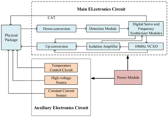 The hydrogen maser circuit is mainly composed of a main electronic circuit and an auxiliary electronic circuit. The main circuit part includes a 10 MHz crystal oscillator with a constant temperature, an isolation amplifier circuit, an up-conversion circuit, a down-conversion circuit, a digital servo, and a frequency synthesizer circuit, while the auxiliary circuit includes a constant temperature circuit, a high-voltage source, and a constant current source. The internal working principal block diagram is shown in Figure 1.