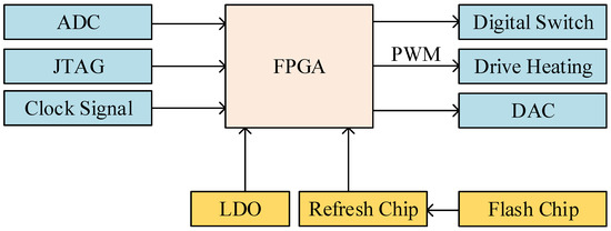 The digital circuit designed in this paper was based on the XC4VSX35 FPGA chip manufactured by the Xilinx company. Virtex-4 devices are user-programmable gate arrays with various configurable elements and embedded cores optimized for high-density and high-performance system designs [21,22]. The block diagram of the peripheral circuit with the FPGA as the core is shown in Figure 3: the power chips provide various power supplies to the FPGA; the peripheral clock circuit provides clock signals for FPGA; the refresh chip reloads and periodically refreshes the programs from the Flash chip to FPGA through the interface, facilitating in-orbit reconstruction; the JTAG circuit is used to download and debug the program; the analog-to-digital converter (ADC) chips sample and quantize analog quantization before transmitting the data to the FPGA; and, finally, the FPGA chip generates control quantities to drive the digital-to-analog converter (DAC) chips, digital switches, and heating modules.