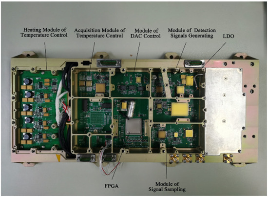 Compared with analog circuits, digital circuit components are smaller in size and have lower power consumption, features which are conducive to integration. The prototype of the hydrogen maser’s new digital circuit is shown in Figure 4. The digital circuit reduces the power ripple by using low-dropout regulator (LDO) chips and selecting low-temperature-drift and low-noise electronic components, which effectively reduces the impact of digital noise on the frequency stability of the hydrogen maser.