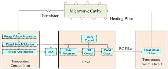 The temperature control circuit system in the hydrogen maser mainly consisted of a temperature data acquisition module, a controller module, and a driving heating module. The block diagram of the temperature control system is shown in Figure 5. The temperature acquisition module included a Wheatstone bridge circuit, a multiplexer circuit, and an amplifier circuit. An eight-select-one channel selector selected the signal path and output it to the amplifier. A 14-bit ADC chip sampled the signal; then, the sampled data entered the FPGA. At the target temperature, the change in the thermistor caused the output voltage to change by about 0.0016 V, which reflects a temperature change of . The resolution of the temperature control ADC was 0.0003 V, and the change of the thermistor could be completely identified. The temperature sampling time at each part was 2 s, and the temperature control time constant was on the order of hundreds of seconds. The volume and mass of the hydrogen maser were relatively large, and the temperature changed slowly. The influence of the differential term was very small, and only PI control was used in the experiment. The FPGA chip was the core of the controller module; it processed the sampled signal data and generated pulse width modulation (PWM) control signals.