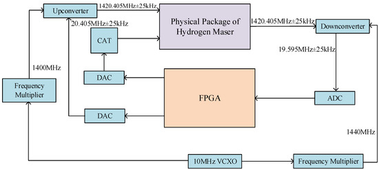 The schematic diagram of the closed-loop control system of the active hydrogen maser, which used the external detection signal tuning method, is shown in Figure 6. The digital circuit output detection signals of (1,420,405.751 ± 25) kHz through the upconverter. The output signals from the hydrogen maser were mixed and amplified by the downconverter. After ADC sampling, the intermediate frequency signals of 20.405 MHz entered the FPGA for digital filtering and synchronous detection processing. Then, the amplitudes of the left and right detection signals that passed through the cavity were detected, and the amplitude difference could be calculated. After passing through the servo module, the control signal was output through DAC to the varactor diode in the physical part of the hydrogen maser, thereby achieving the locking of the central resonant frequency of the microwave cavity.
