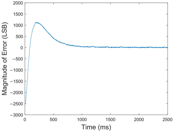 The locking loop of the crystal oscillator was analyzed and debugged by ChipScope Pro, an internal logic analyzer of Xilinx Company in San Jose, California, USA. The error curve of the crystal oscillator loop is shown in Figure 8, and the crystal oscillator was locked within 1 s. The frequency stability of the hydrogen maser at 1 s was determined by the crystal oscillator, thus requiring the crystal oscillator to be locked within seconds. As the error between the crystal oscillator loop and the cavity loop gradually decreased to 0, the hydrogen maser was in a locked state, and the circuit output a 10 MHz frequency signal with high stability and accuracy.