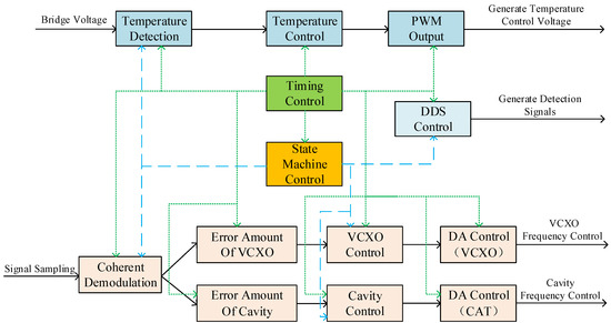 According to the functional requirements of the closed-loop control system, the design of the software system was completed on the FPGA chip. The software can be divided into functional modules such as signal demodulation, crystal oscillator control, cavity frequency control, state machine, timing generation, DDS control, temperature detection, temperature control, PWM control voltage output, etc. Part of the software’s architecture is shown in Figure 9: