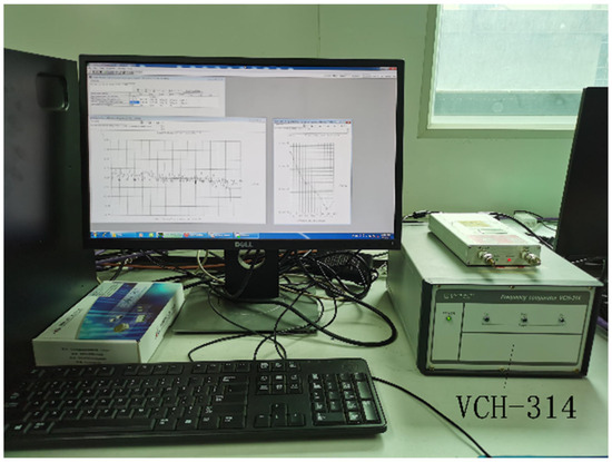 The VCH-314 frequency comparator was used to test the frequency stability. The VCH-314 frequency comparator is intended for precise measurements of phase and frequency instability. It contains two identical measuring channels. Using the cross-correlation technique allowed us to obtain a super-low measurement error and to calculate the frequency instability of each signal separately. In this paper, the 10 MHz output signal from the Russian ground active hydrogen maser VCH-1003 M was used as the reference signal, and the locked 10 MHz standard output signal from the new lightweight active hydrogen maser was used as the measured signal, as shown in Figure 10.