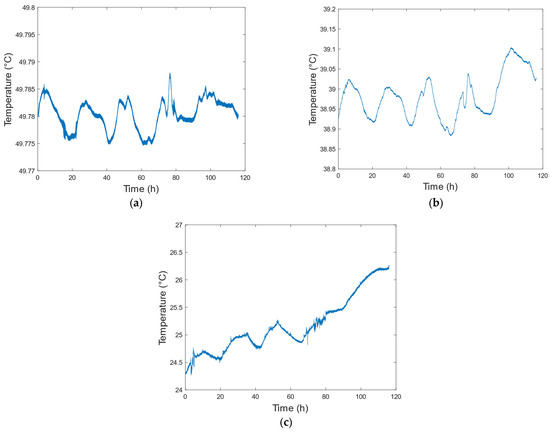 Temperature variation curves of (a) cavity; (b) outer shield; and (c) laboratory.