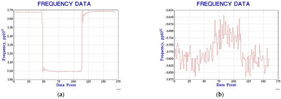 We used VCH-314 to assess the frequency of the 10 MHz output signal from the new lightweight active hydrogen maser, and the sampling interval was 1 s. The collected data were processed in Stable32 to compare the frequency change before and after the nickel purifier tuning. Prior to nickel purifier tuning, the nickel purifier current was adjusted from 2.9 A to 2.2 A, and then subsequently from 2.2 A to 2.9 A, which caused a frequency change of about , as shown in Figure 13a. After tuning, the same change in the nickel purifier current resulted in a frequency change of about , as shown in Figure 13b. It could be seen that the nickel purifier tuning greatly reduced the influence of the hydrogen maser’s output frequency with the variation in hydrogen flow.