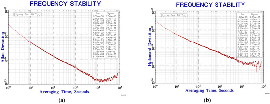 Figure 14 shows the comparison results of a longer frequency stability test. The sampling interval of the VCH-314 was 1 s, and the comparison time was more than 420,000 s. In total, 42 million seconds fully achieved confident frequency stability at 10,000 s. The temperature change in the microwave cavity during this period is shown in Figure 11a. The short-to-medium-term frequency stability of the closed-loop test was good, the frequency stability reached and . However, the frequency stability curve showed an upward trend starting from 10,000 s due to frequency drift, as shown in Figure 14a. The frequency stability curve after deducting the frequency drift using Hadamard variance is shown in Figure 14b.