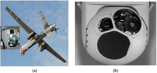An airborne optoelectronic stabilization platform refers to the device used in carrier systems, which uses a gyroscope as the sensitive element and a servo control algorithm to isolate the carrier disturbance, so as to maintain the stability of the detector’s visual axis in inertial space and realize the functions of target acquisition, tracking, and aiming [1,2]. Figure 1 shows the schematic diagram of UAV and airborne optoelectronic platform.