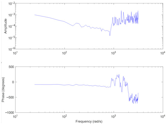 , , and are the tracking loop, speed loop, and current loop controllers, respectively, is the control model to be identified, , and are detected miss distance, speed, and current respectively, and are input values for speed and current loops. is the input signal of the sweep frequency test, and is the output signal of the sweep frequency test. is a sine signal ranging from 0 Hz to 300 Hz, collecting the sweep frequency output signal, and using the MATLAB system identification toolbox for model identification, as shown in Figure 9. Without considering the mechanical resonance link, .