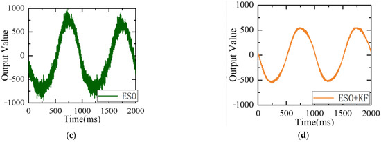 Comparison of speed fluctuation and output between the ESO and ESO + KF under the same disturbance source: (a) speed fluctuation of the ESO; (b) speed fluctuation of the ESO + KF; (c) output of the ESO under disturbance; and (d) output of the ESO + KF under disturbance.