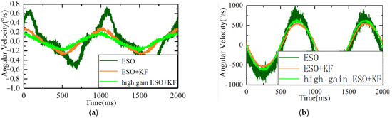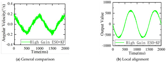 From observing Figure 16 and Table 1, it can be concluded that under the condition of a 1°1 Hz swing, with the same gain, the ESO + KF stationary speed errors were reduced from 0.72°/s to 0.28°/s, and the standard deviation was reduced from 0.32°/s to 0.17°/s. The results show that the ESO + KF had better immunity performance, and the high-gain ESO + KF can further reduce stationary errors to 0.19°/s and the standard deviation to 0.11°/s. The high-gain ESO + KF algorithm has a faster response speed while reducing the burden on the controller. It can be concluded that the ESO + KF can reduce the noise of the gyroscope, while also improving the immunity performance and reducing the burden on the controller, which can further improve the ESO’s gain and immunity level.