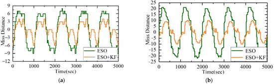 Comparison of off-target quantities between the ESO and ESO + KF under different disturbances: (a) disturbance of 1°/1 Hz and (b) disturbance of 3°/1 Hz.