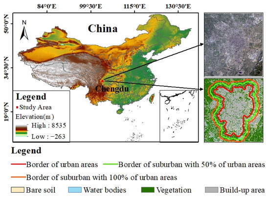Due to Chengdu being the sixth-largest city in China, its administrative boundaries encompass not only urban areas but also extensive suburban regions, which do not align with the requirements of the SUHI study. Therefore, in this study, urban and suburban areas were separated according to four land cover classification types from landcover maps. An urban area is defined as a high-intensity and densely occupied areas near a built-up area. After the urban area is determined, a suburban area is defined as the buffer zone that includes a smaller suburban area (50% of the urban area) and a larger suburban area (100% of the urban area) around the urban area (Figure 5).
