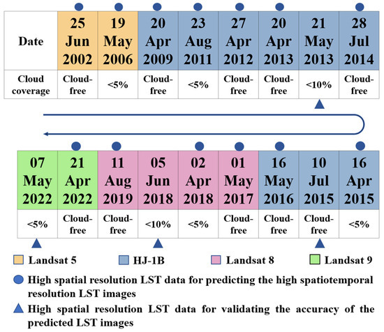 The proposed MGWR-CFSDAF method mainly needs, at least, a pair of high and low-spatial-resolution LST data on the prior date and one set of low-spatial-resolution LST data on the predicted date. In this study, due to limitations of cloudy and rainy weather, we can only select seventeen Landsat LST and HJ-1B LST data from 2002 to 2022 as the high spatiotemporal LST data through blending with low-spatial-resolution MODIS LST data for predicting high-spatiotemporal-resolution LST data. As shown in Figure 2, there are ten high-spatial-resolution LST images without clouds and seven LST images have a cloud cover ranging from 0% to 10%.