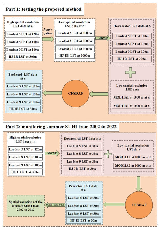 In this study, in order to generate the 30 m spatial resolution and 8-day temporal resolution summer LST dataset from 2002 to 2022, a multiscale geographically weighted regression MGWR coupling CFSDAF method was proposed. The implementation consists of testing the proposed method part and monitoring the summer daytime SUHI part (Figure 3). If the performance of the first part is better, we can conduct the next part.