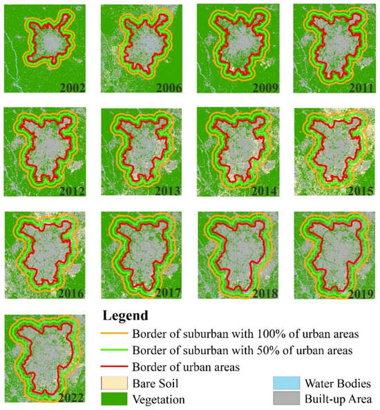 The delineation of urban and suburban areas over Chengdu City from 2002 to 2022.