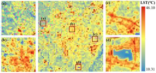 MGWR is an extension of the generalized linear regression, with NDVI, DEM, slope, and aspect as the nominated environmental variable set that is highly LST-related. Firstly, high-spatial-resolution LST at the t1, such as Landsat 9 LST observed on 21 April 2022 (Figure 6) with 100 m resolution, was aggregated to 1000 m. The LST downscaling results from MGWR from 1000 m to 100 m is shown in Figure 6, where four kinds of subareas, notably subarea (Figure 6a) in vegetation, subarea (Figure 6b) in built-up area, subarea (Figure 6c) in bare soil area, and subarea (Figure 6d) in waterbody area, were used to show the LST downscaling performance using MGWR. Visually, MGWR can extract more spatial texture information from land surface temperature data, effectively revealing temperature distribution variations within similar land cover types.