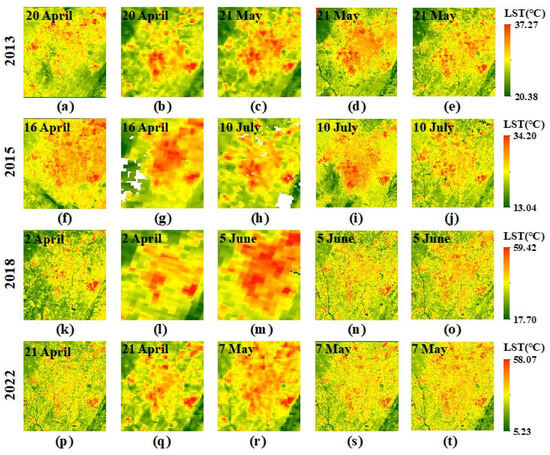 Spatial distributions of LST: (a) 300 m downscaled LST at t1 on 20 April 2013; (b) 1000 m MOD11A1 at t1 on 20 April 2013; (c) 1000 m MOD11A1 at t2 on 21 May 2013; (d) 300 m predicted LST on 21 May 2013; (e) observed LST at t2 on 21 May 2013; (f) 300 m downscaled LST at t1 on 16 April 2015; (g) 1000 m MOD11A1 at t1 on 16 April 2015; (h) 1000 m MOD11A1 at t2 on 10 July 2015; (i) 300 m predicted LST on 10 July 2015; (j) observed LST at t2 on 10 July 2015; (k) 100 m downscaled LST at t1 on 2 April 2018; (l) 1000 m MOD11A1 at t1 on 2 April 2018; (m) 1000 m MOD11A1 at t2 on 5 June 2018; (n) 100 m predicted LST on 5 June 2018; (o) observed LST at t2 on 5 June 2018; (p) 100 m downscaled LST at t1 on 21 April 2022; (q) 1000 m MOD11A1 at t1 on 21 April 2022; (r) 1000 m MOD11A1 at t2 on 7 May 2022; (s) 100 m predicted LST on 7 May 2022; (t) observed LST at t2 on 7 May 2022.