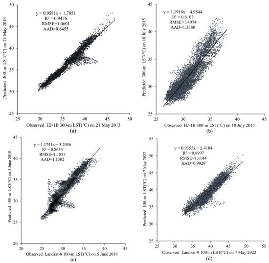 Scatter plots of the relation between observed LST and predicted LST image for: (a) 21 May 2013, (b)10 July 2015, (c) 5 June 2018, and (d) 7 May 2022.