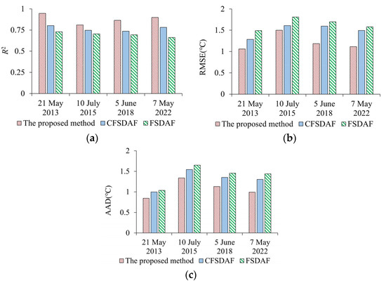 Comparison of the predicted LSTs using the proposed method and CFSDAF, FSDAF. (a) the coefficient of determination (R2); (b) the root mean square error (RMSE); (c) the absolute average difference (AAD).